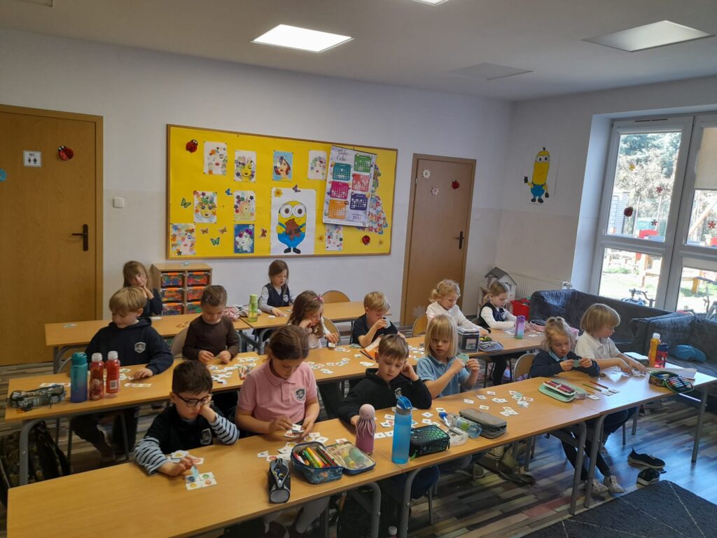 Podczas zajęć matematycznych w zerówce dzieci wcieliły się w rolę posiadaczy kolorowych diamentów. Ich zadaniem było wycięcie przygotowanych rysunków przedstawiających diamenty o różnych kształtach, kolorach i wielkościach. Ćwiczenie to rozwijało ważną umiejętność posługiwania się nożyczkami oraz wspierało motorykę małą.💎💠✂️ Następnie, wykorzystując przygotowane elementy, wspólnie układaliśmy różnorodne zadania matematyczne. Dzieci ćwiczyły klasyfikowanie według wybranych cech (kolor, kształt, wielkość), a także porównywanie i przeliczanie zbiorów. Podejmowały również próby wykonywania prostych działań matematycznych.🔢➕➖🟰 Poprzez wspólną zabawę uczniowie rozwijali wiele kluczowych umiejętności matematycznych, ucząc się jednocześnie współpracy i logicznego myślenia.🧠🤓✌️🔢