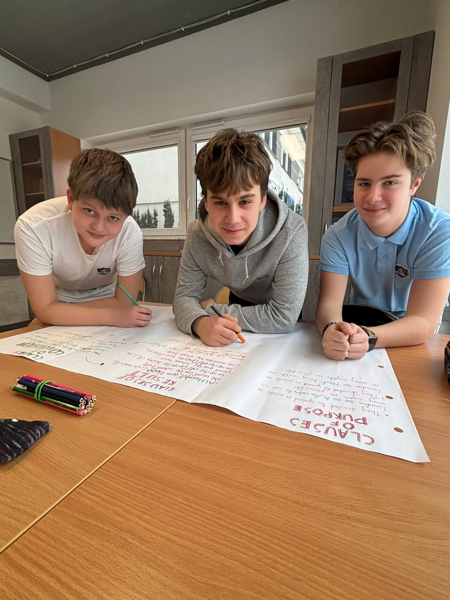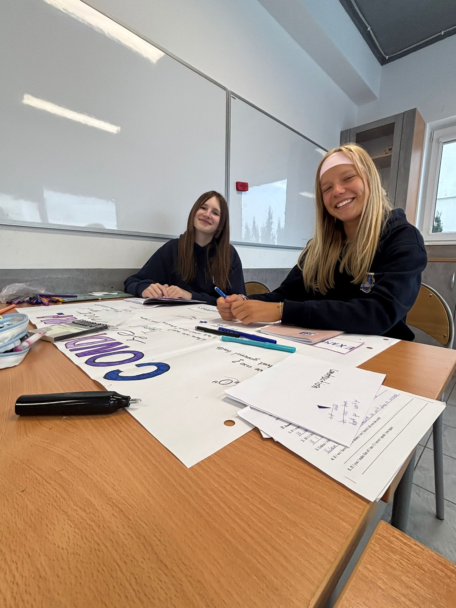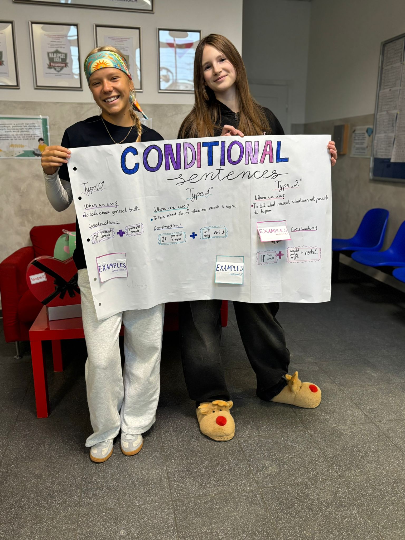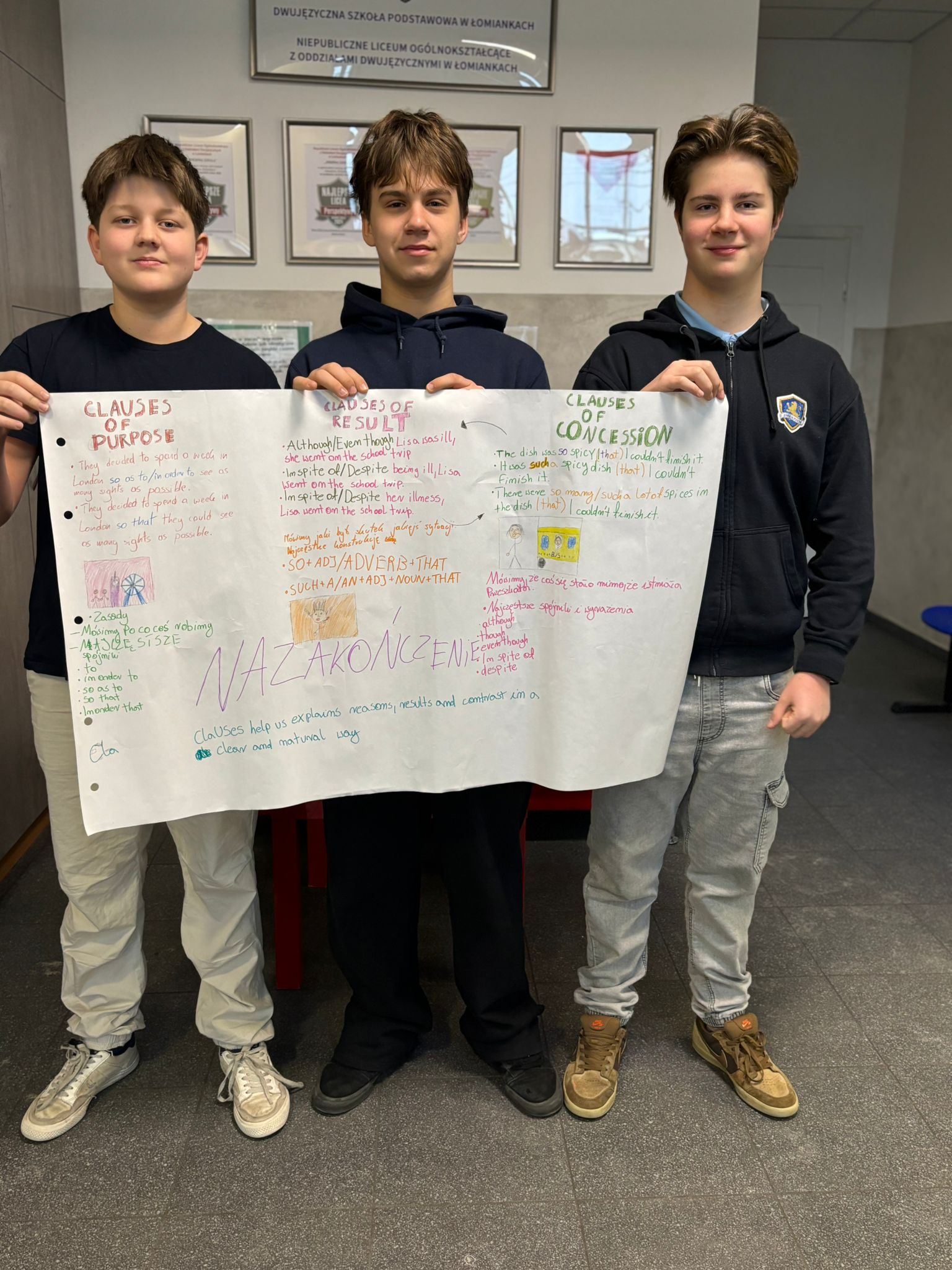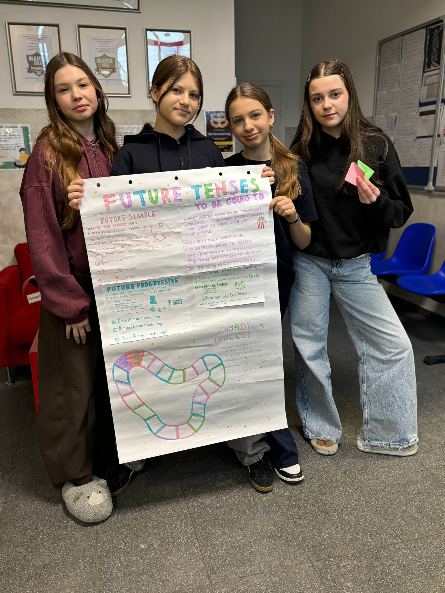 Po przygotowaniach przyszedł czas na prezentacje. Uczniowie z dumą przedstawiali swoje plakaty przed klasą, tłumacząc, jak poprawnie stosować dane konstrukcje gramatyczne. Podczas wystąpień nie zabrakło także quizów i gier, które uczniowie przygotowali samodzielnie. 🧠🎲
