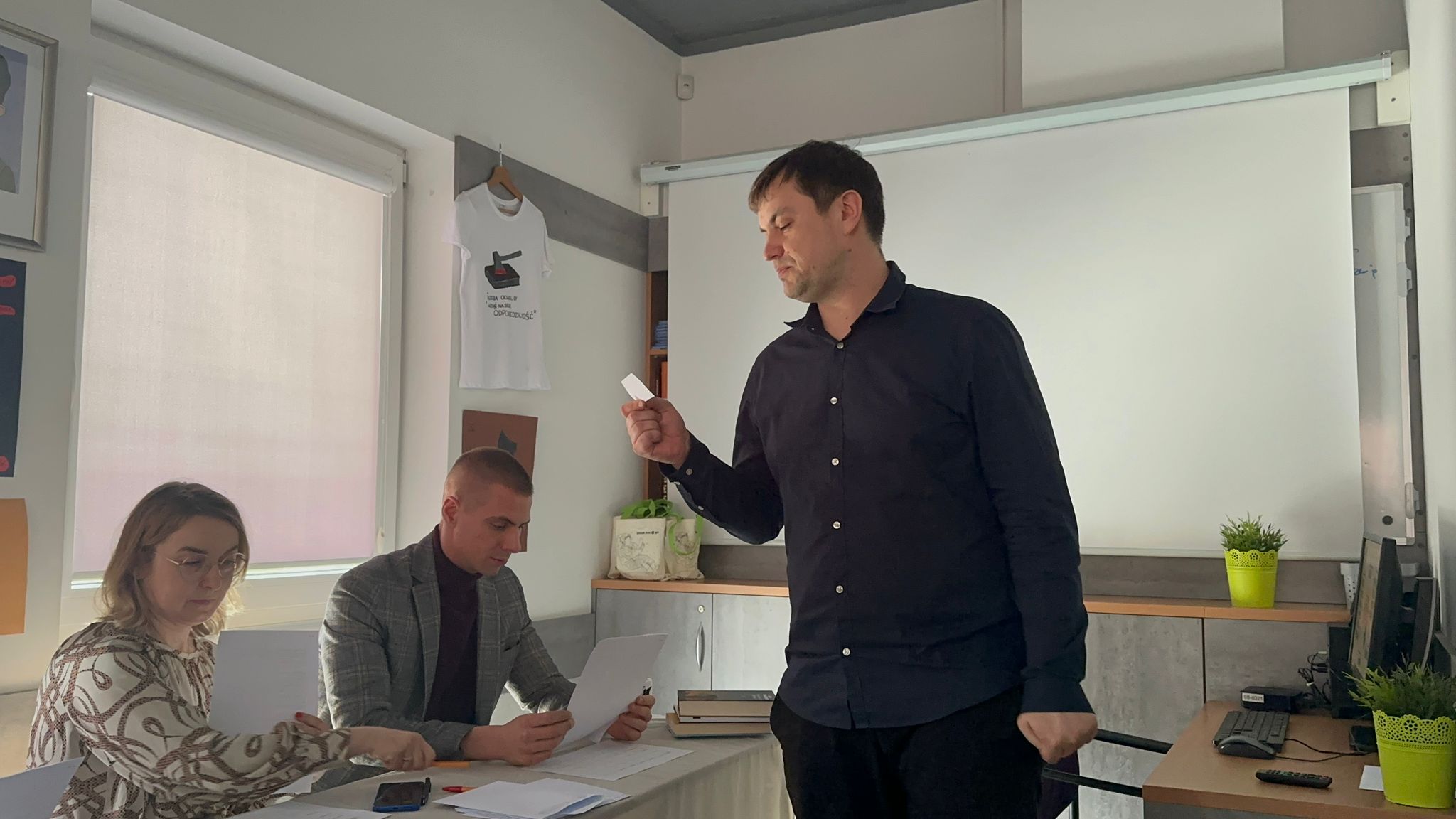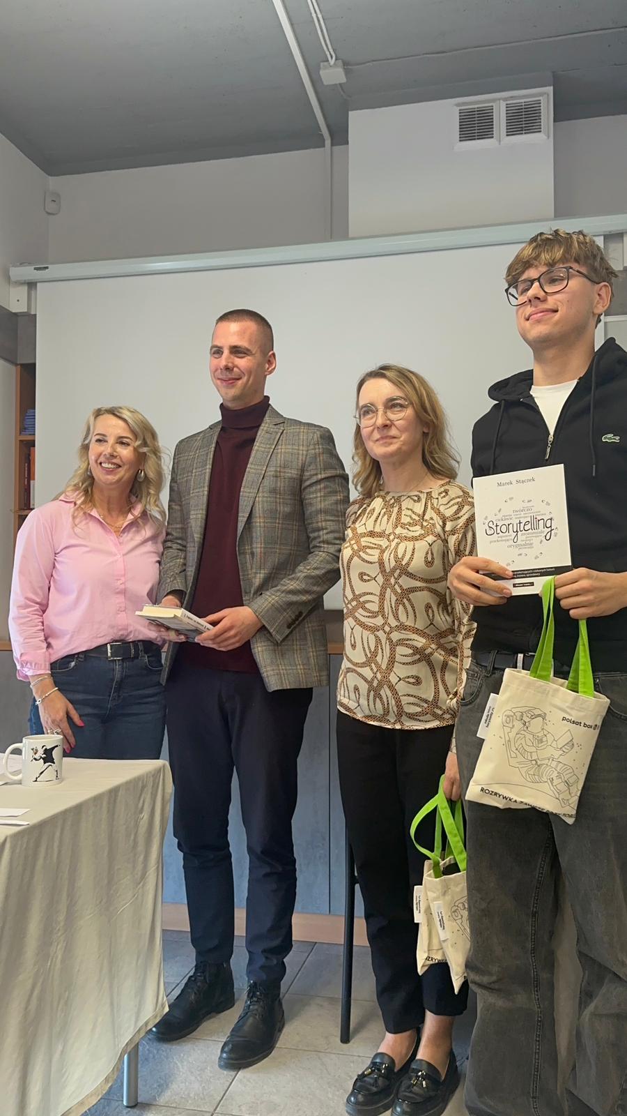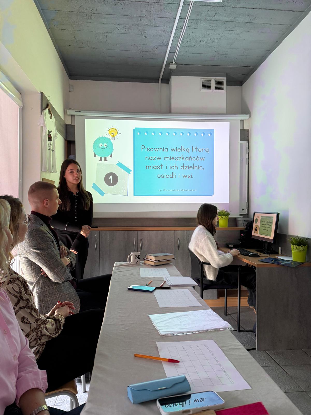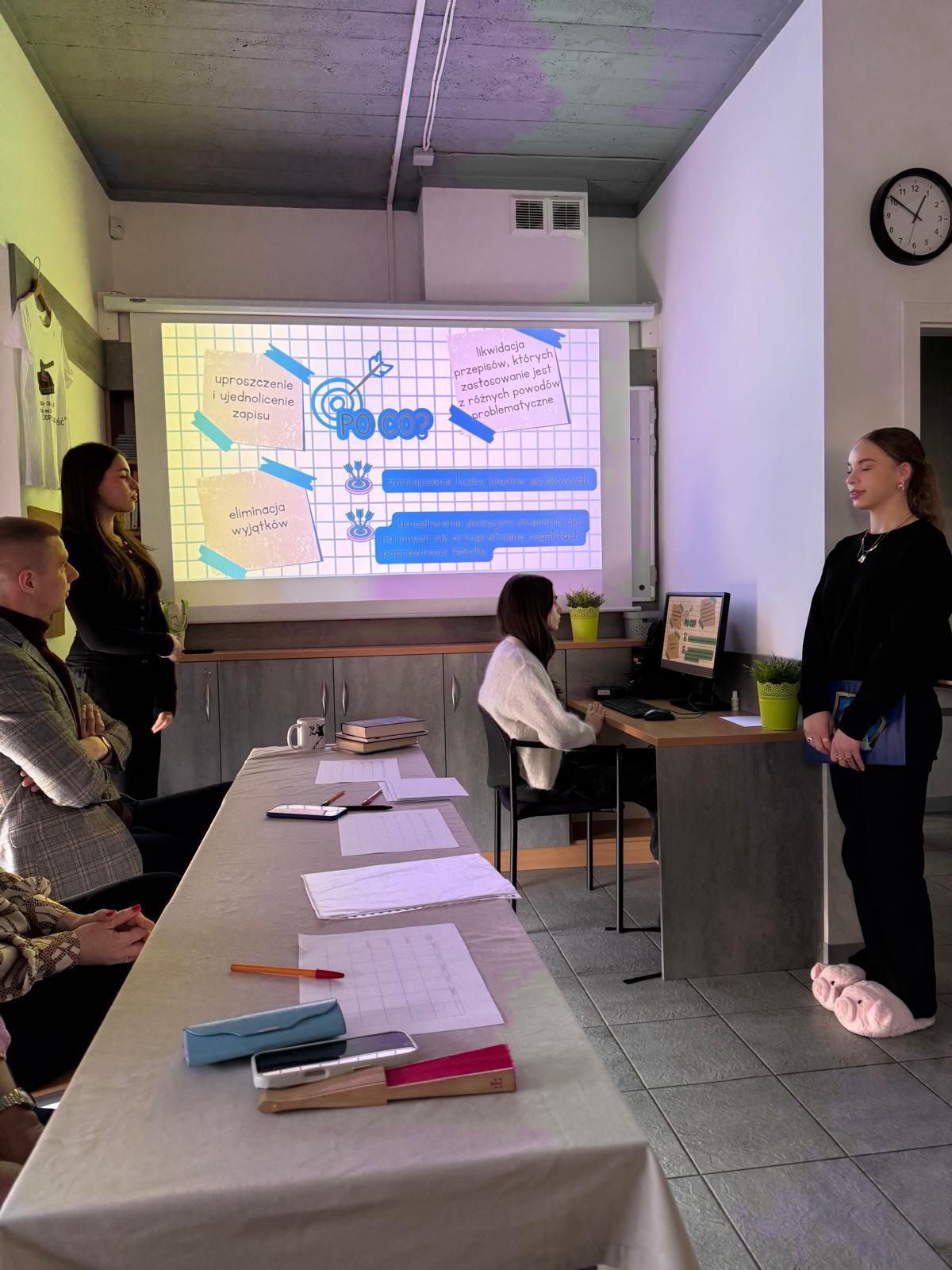 Następnie odbył się uroczysty finał konkursu. Uczennice klasy 3 przedstawiły zmiany w ortografii polskiej, które weszły w życie 1 stycznia 2026r. Potem trójka uczniów i pan Adam stanęli w szranki, aby zdobyć tytuł szkolnego mistrza języka polskiego.