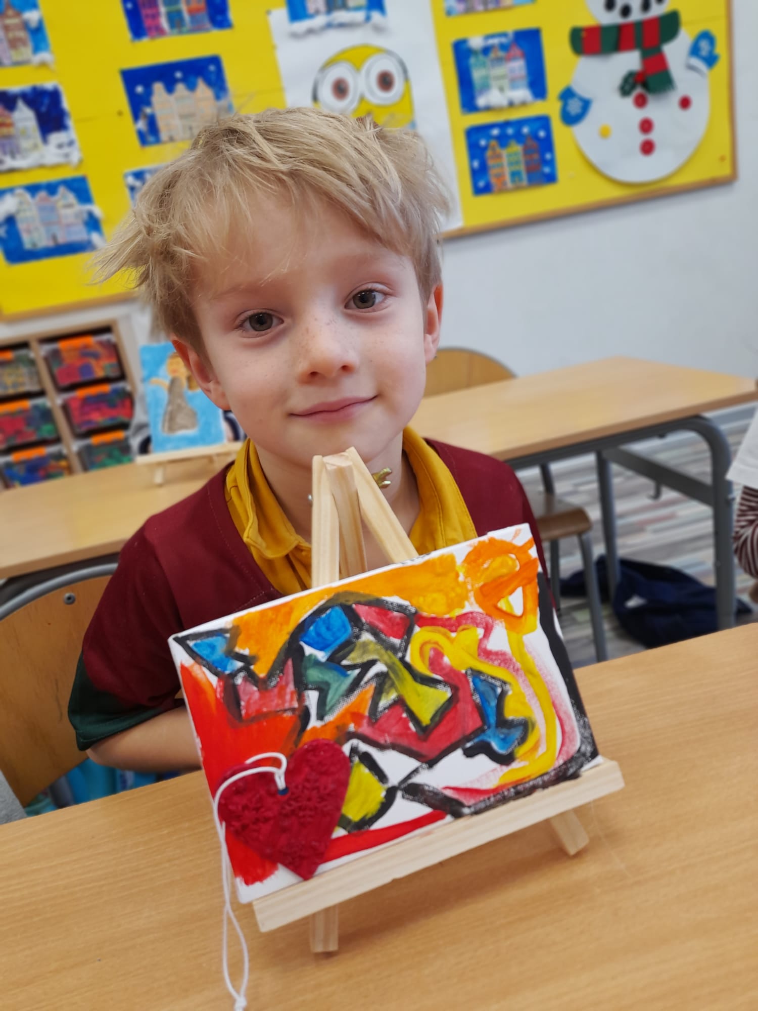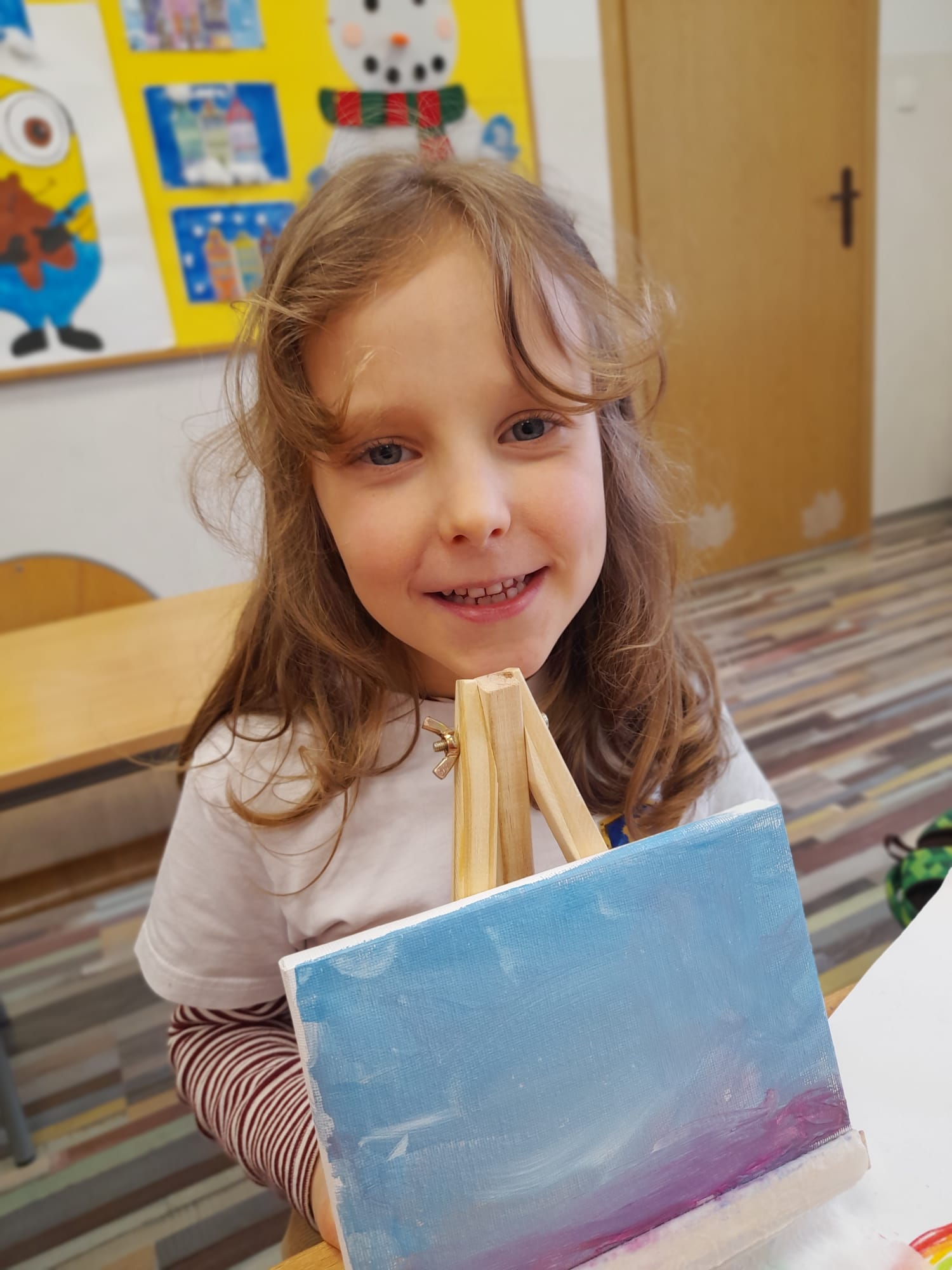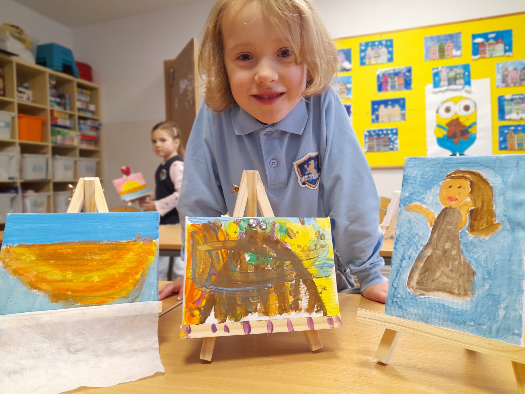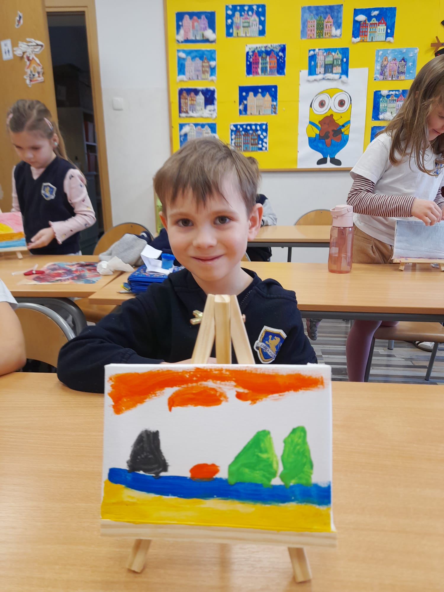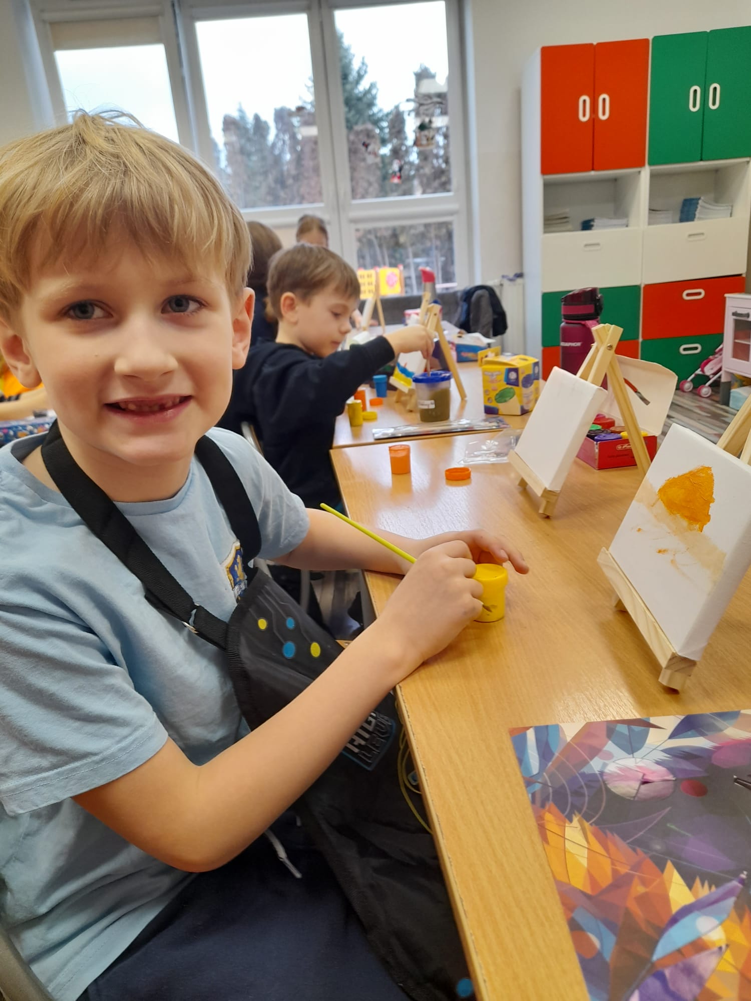 W części praktycznej dzieci tworzyły własne prace plastyczne. Wykonały kolorowe mozaiki, a także malowały farbami na płótnie ustawionym na sztaludze – jak prawdziwi artyści! Każde dziecko stworzyło swój własny, niepowtarzalny obraz, rozwijając wyobraźnię, kreatywność oraz wiarę we własne możliwości.👏🖼️
