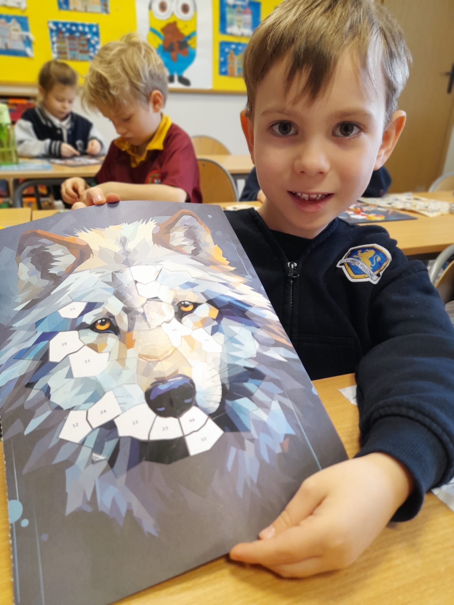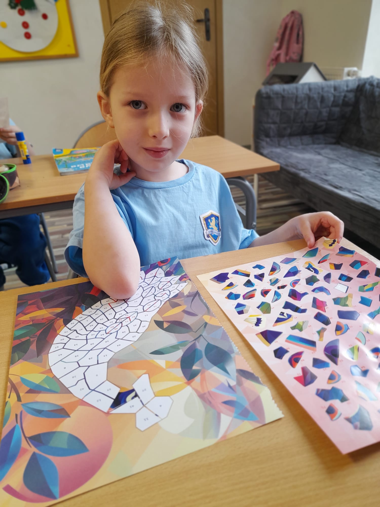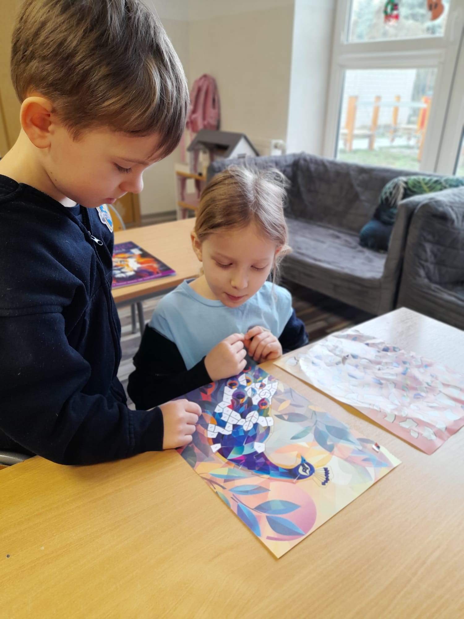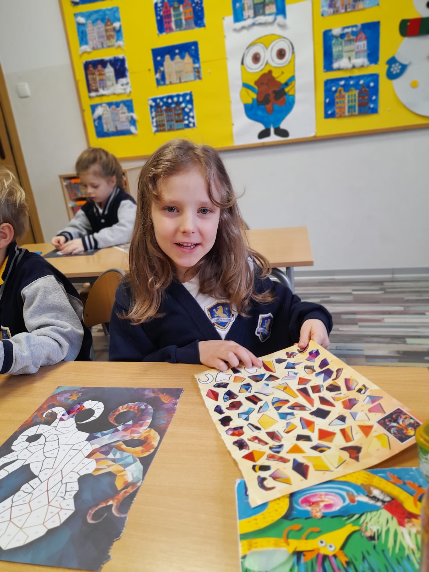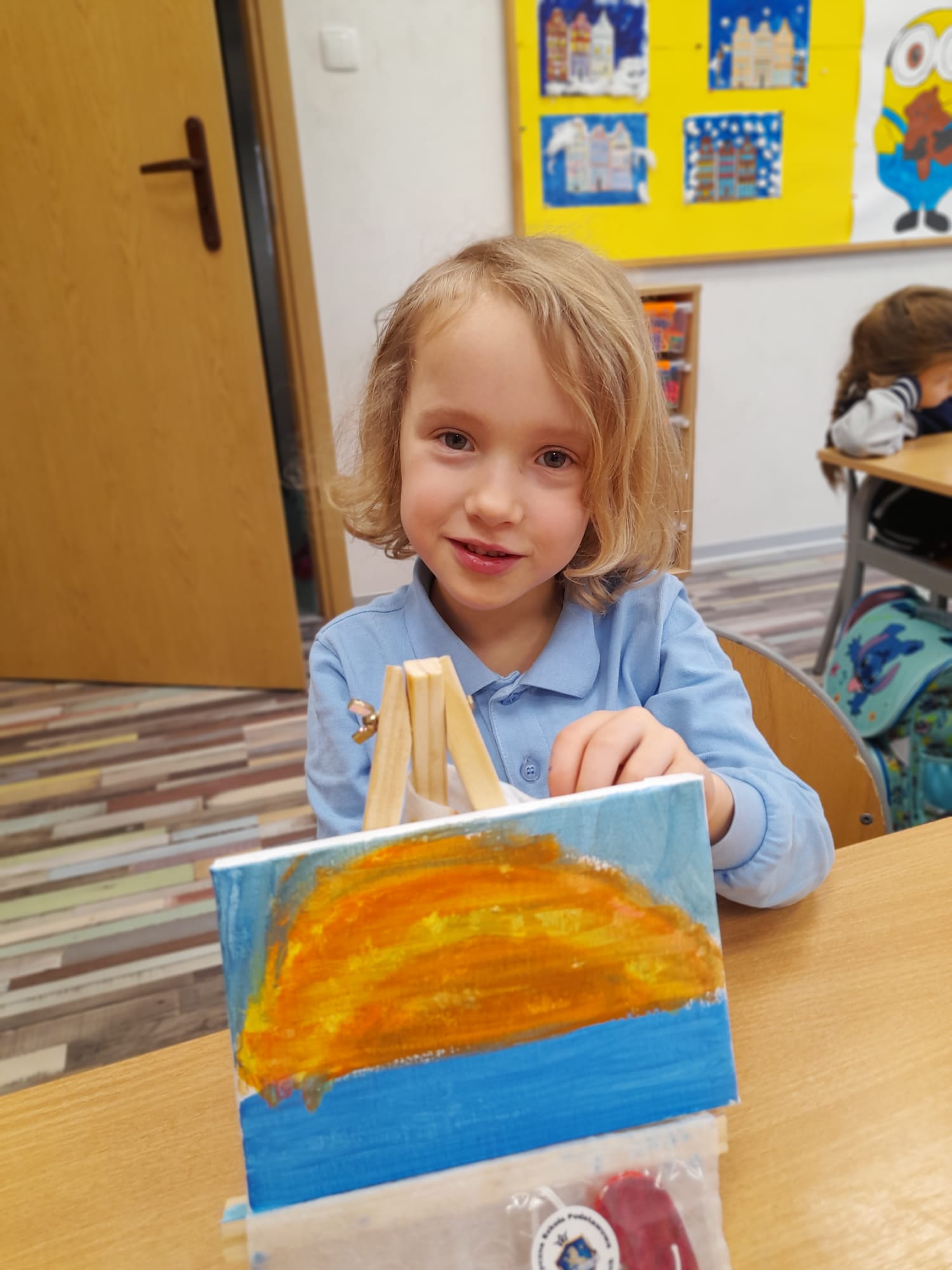 W części praktycznej dzieci tworzyły własne prace plastyczne. Wykonały kolorowe mozaiki, a także malowały farbami na płótnie ustawionym na sztaludze – jak prawdziwi artyści! Każde dziecko stworzyło swój własny, niepowtarzalny obraz, rozwijając wyobraźnię, kreatywność oraz wiarę we własne możliwości.👏🖼️