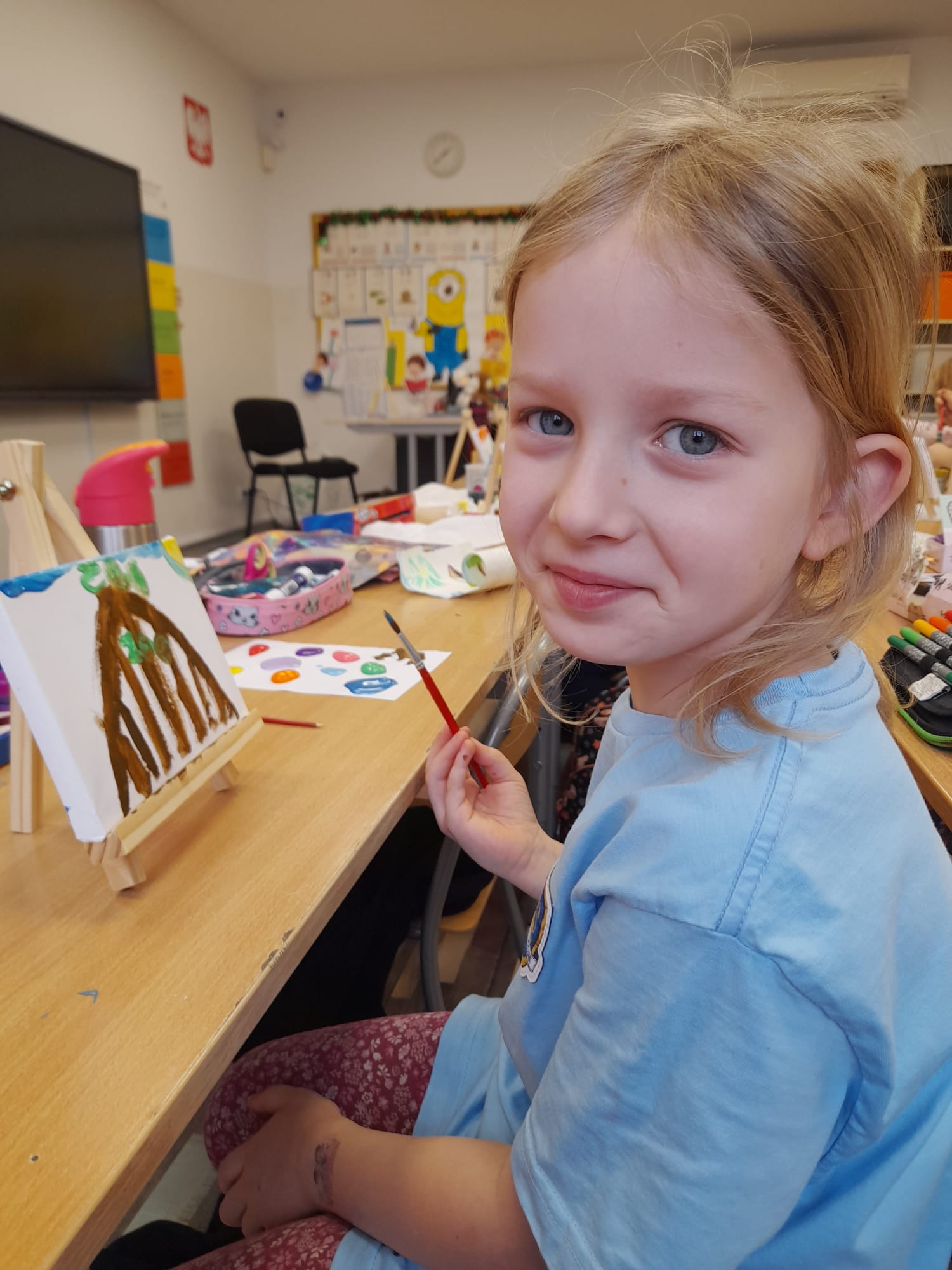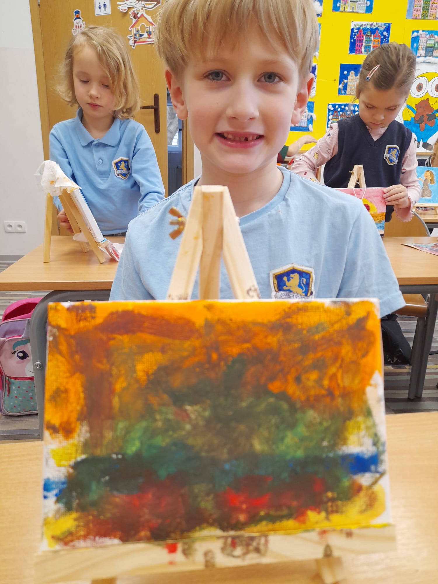 Dzieci poznały różne techniki malarskie – dowiedziały się, czym można malować, na czym powstają obrazy oraz jak krok po kroku wygląda proces ich tworzenia – od pomysłu, przez szkic, aż po gotowe dzieło. Dzieci pracowały z farbami, eksperymentowały z kolorami i uczyły się, jak powstają nowe barwy poprzez ich mieszanie.🎨🌈