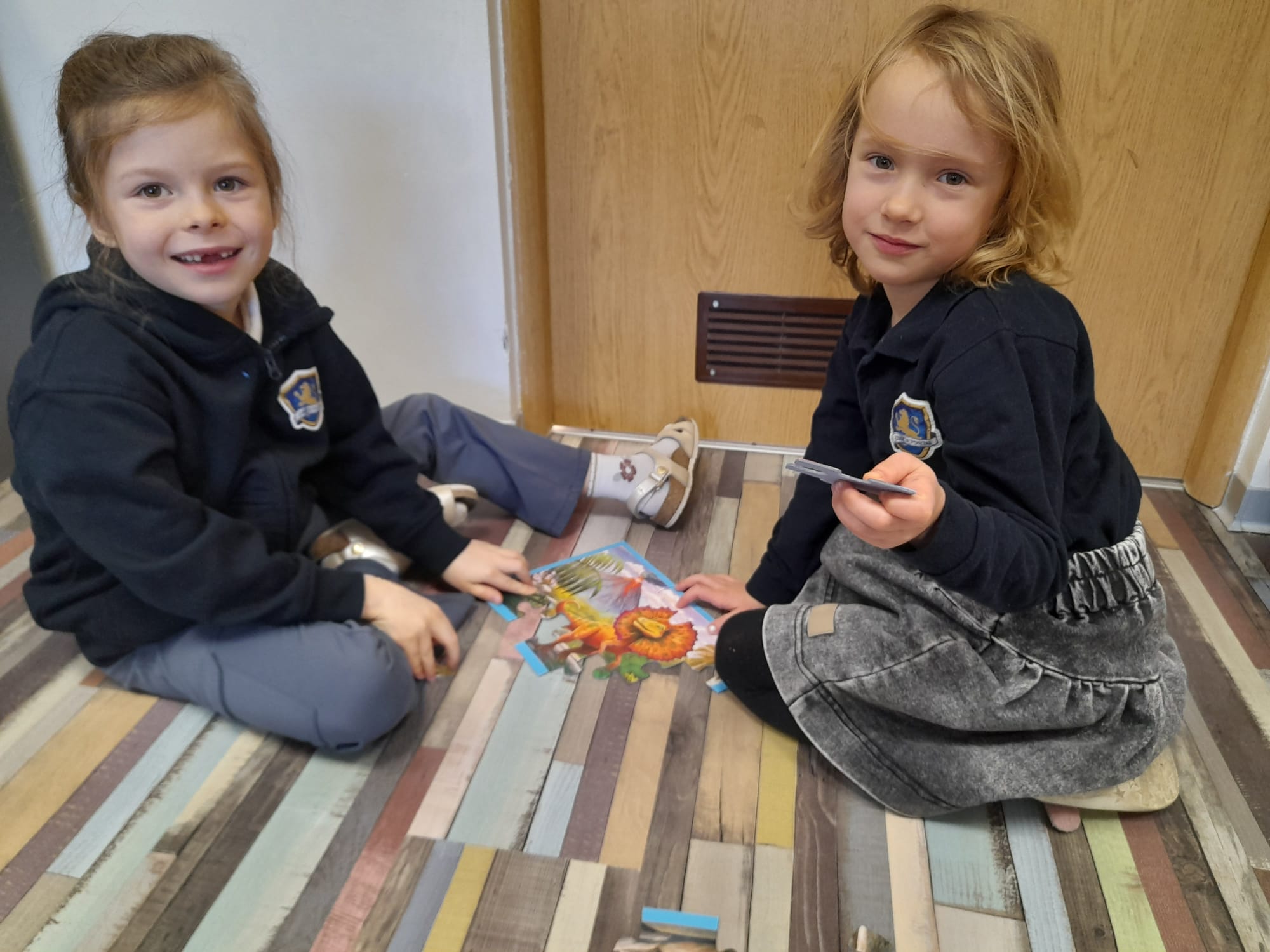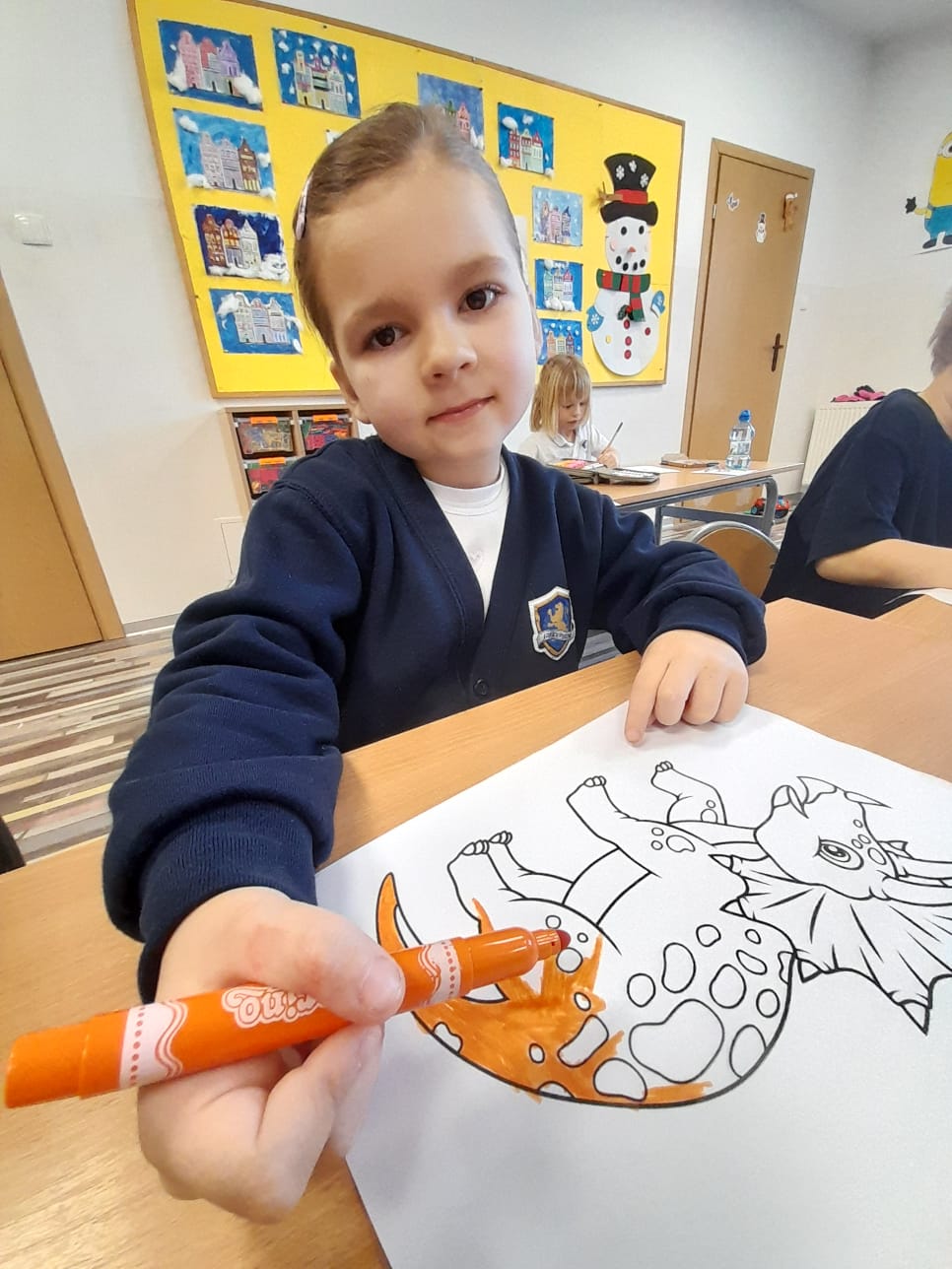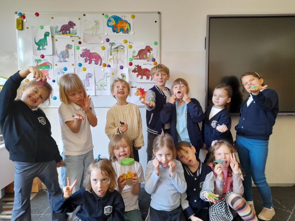 Z okazji Dnia Dinozaura dzieci przeniosły się w fascynujący świat prehistorii. Zajęcia rozpoczęliśmy od pracy w małych grupach – uczniowie układali puzzle przedstawiające sylwety dinozaurów, m.in. Tyrannosaurus rex oraz Triceratops. Wspólne zadanie sprzyjało integracji grupy, rozwijało umiejętność współpracy oraz wzajemnej komunikacji.🦖🧩🦕