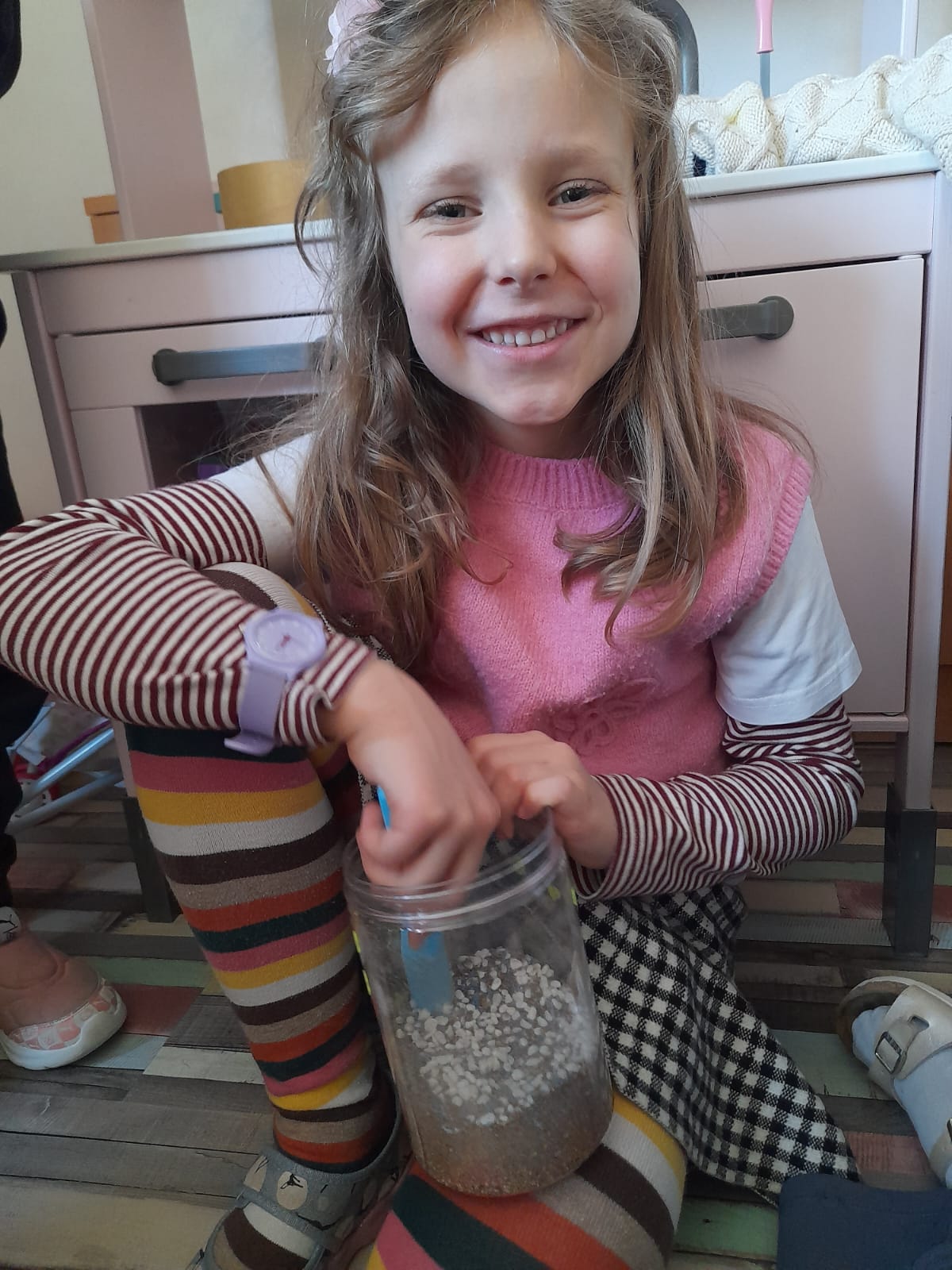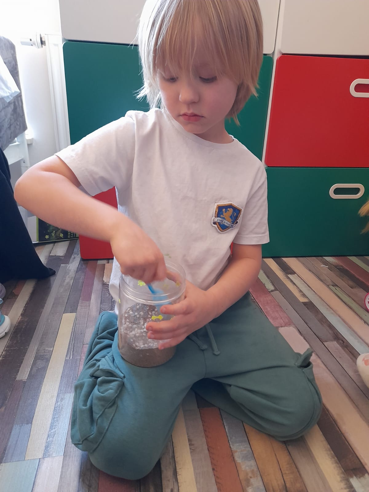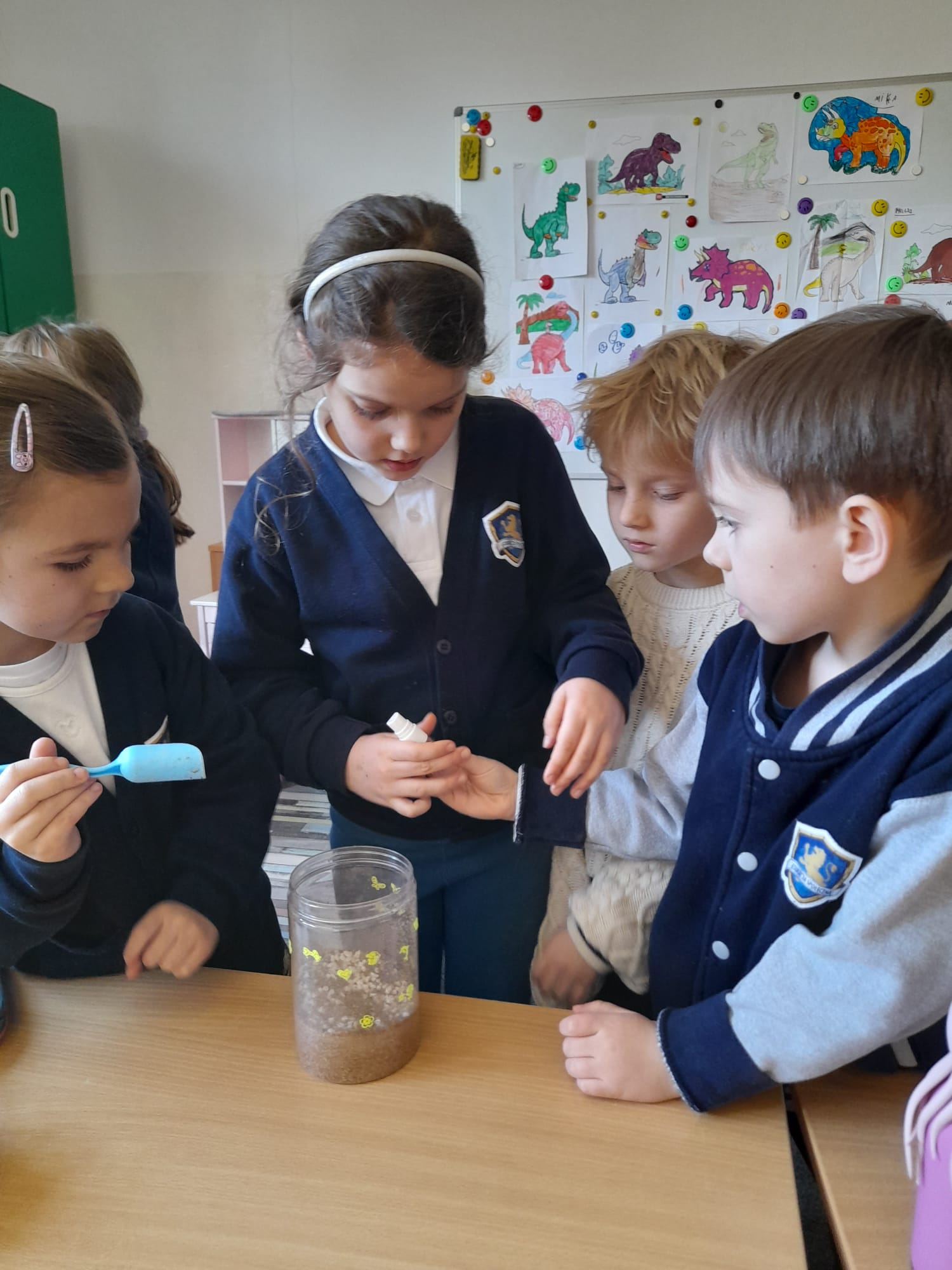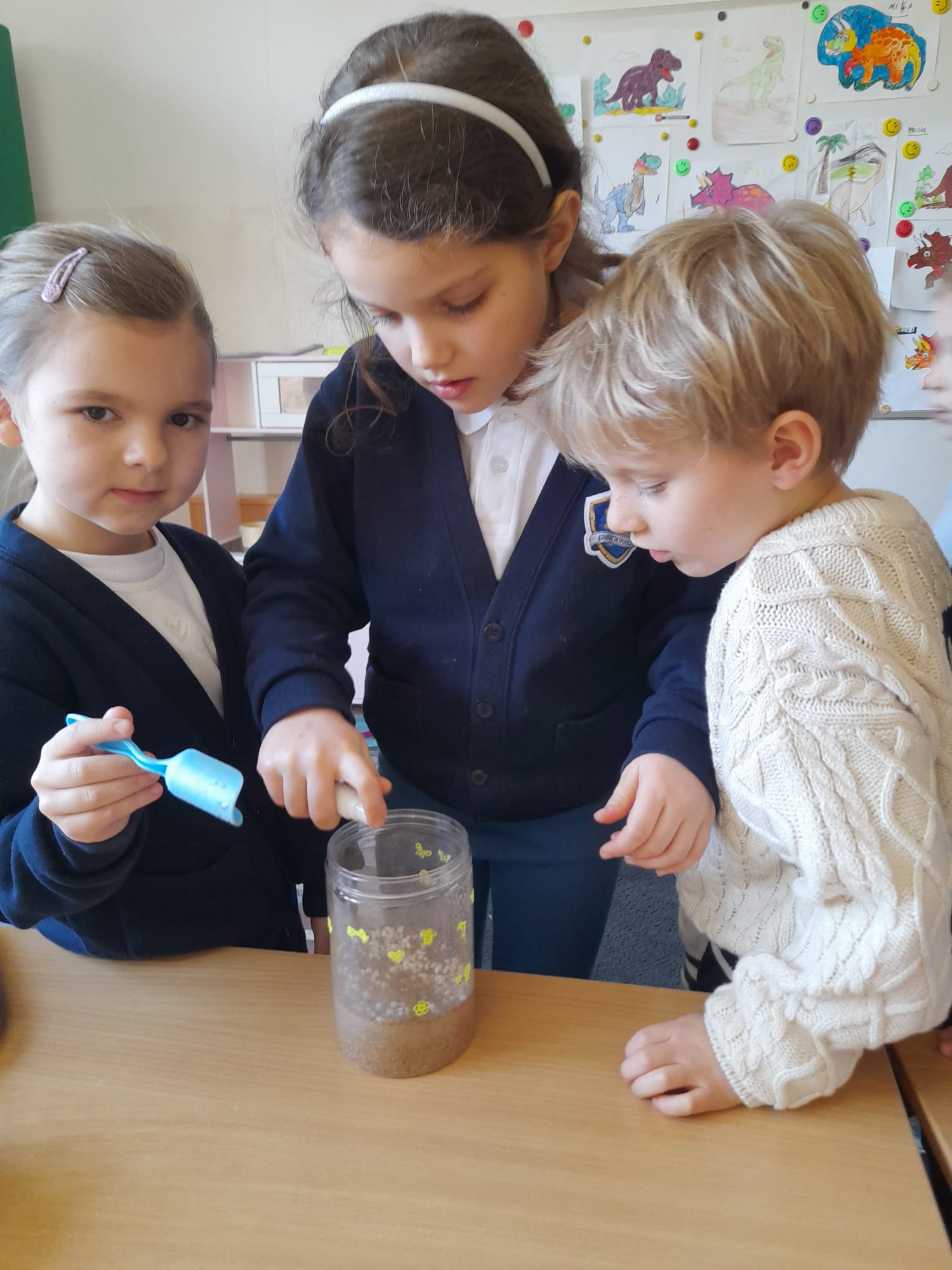 Dużym zainteresowaniem cieszyło się stworzenie ogrodu dinozaurów. Dzieci posadziły ziarna, z których wyrośnie roślinność, a następnie umieściły w „prehistorycznym świecie” figurki dinozaurów. Była to doskonała okazja do rozmów o tym, jak wyglądała przyroda miliony lat temu.🌴🎋🦖