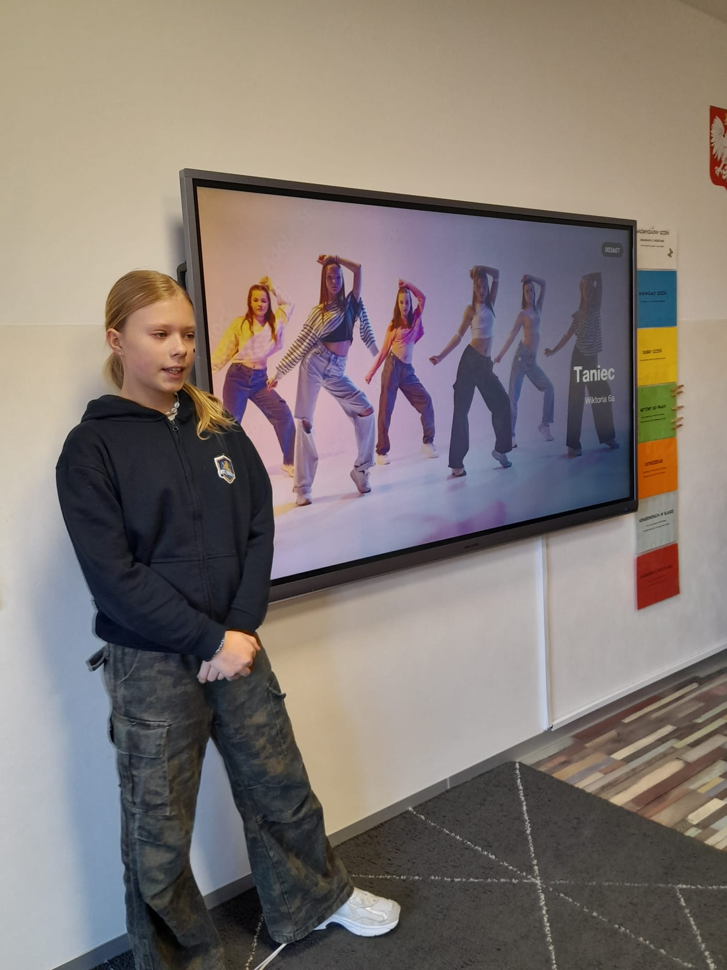 Wiktoria natomiast podzieliła się swoimi artystycznymi i sportowymi pasjami. Opowiedziała o tańcu street dance, który daje jej wiele radości i energii. Z dumą zaprezentowała swój strój taneczny, co wywołało duży entuzjazm wśród uczniów. Pokazała również przykład własnego szkicu, udowadniając, że rozwijanie talentów może być prawdziwą przygodą. Wiktoria wspomniała także o swojej pasji do gry w siatkówkę. 🏐🎨💃🪩👯