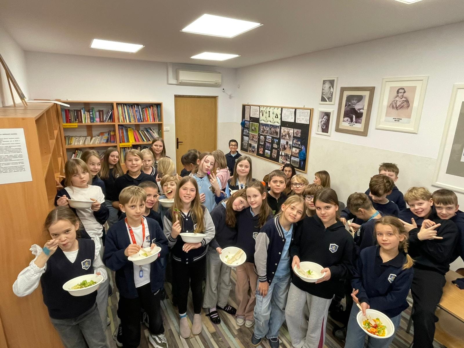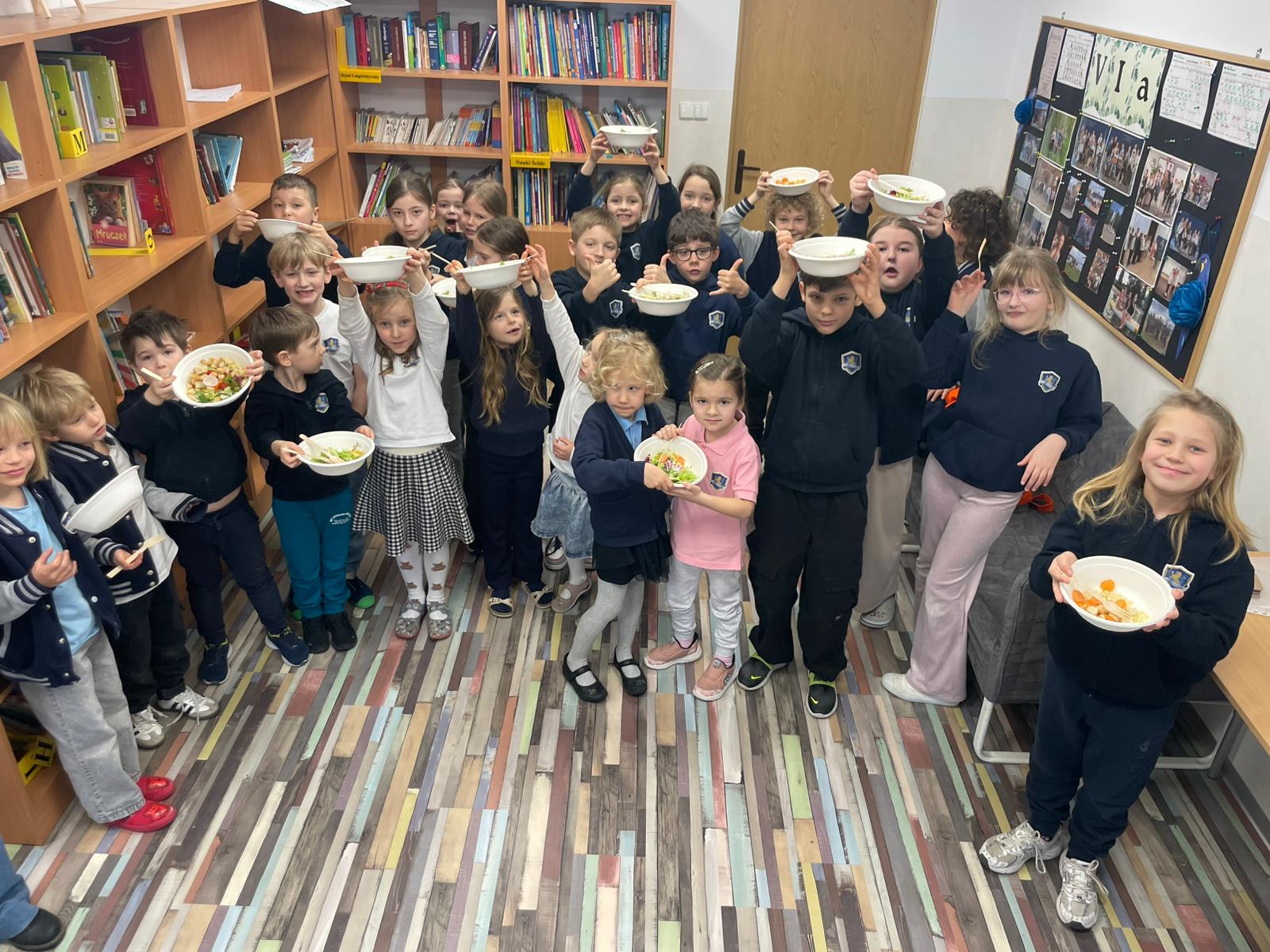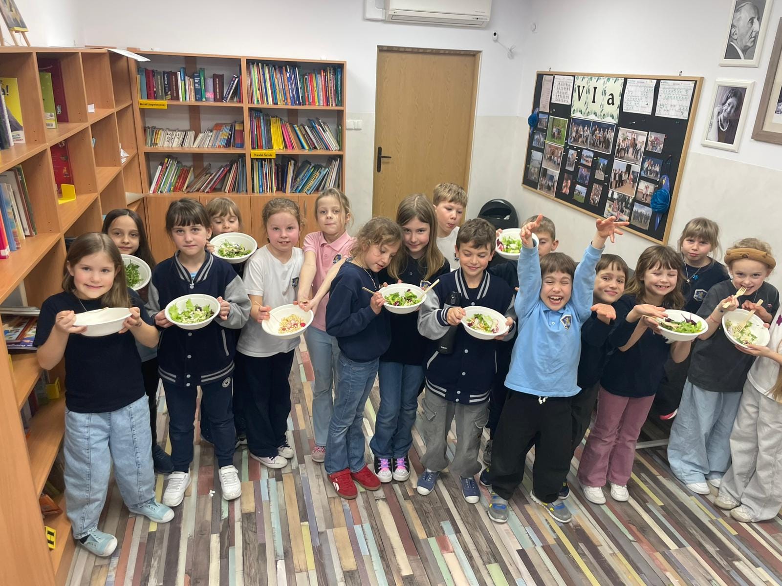 Jednym z najbardziej wyczekiwanych momentów spotkania były zajęcia kulinarne. Pracując w grupach, dzieci przygotowały proste i zdrowe potrawy – kolorowe sałatki, kanapki oraz wrapy. 🥗🥪🌮