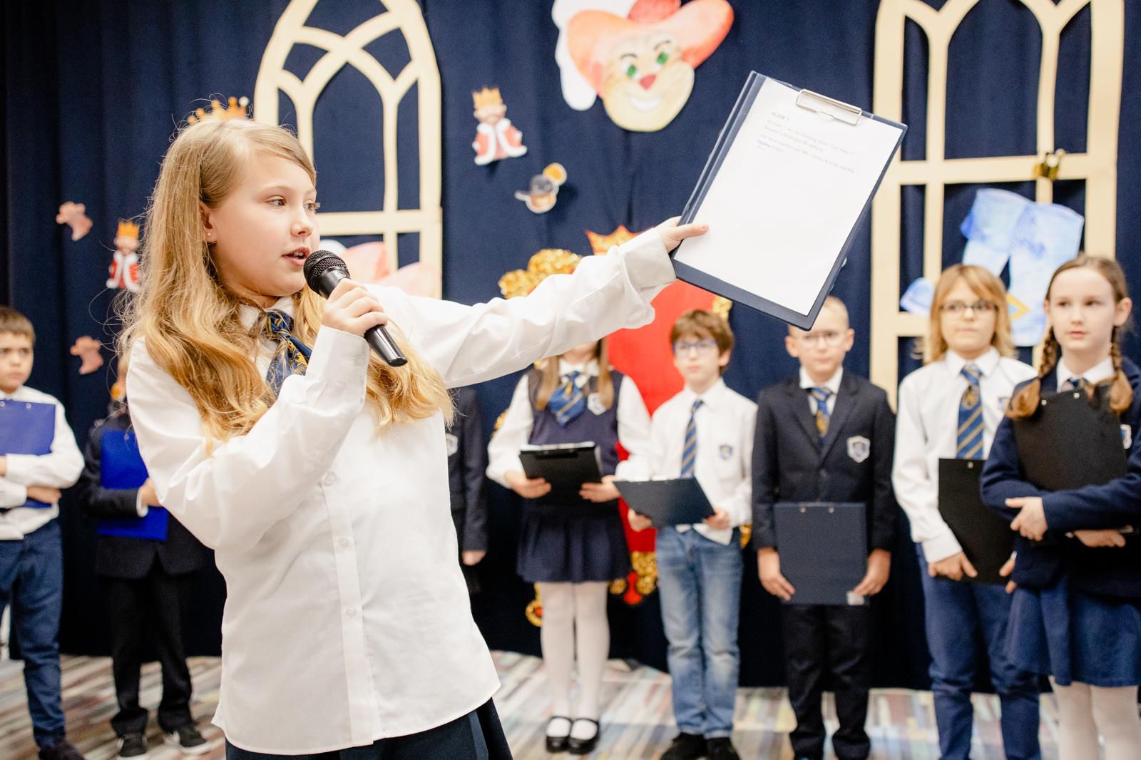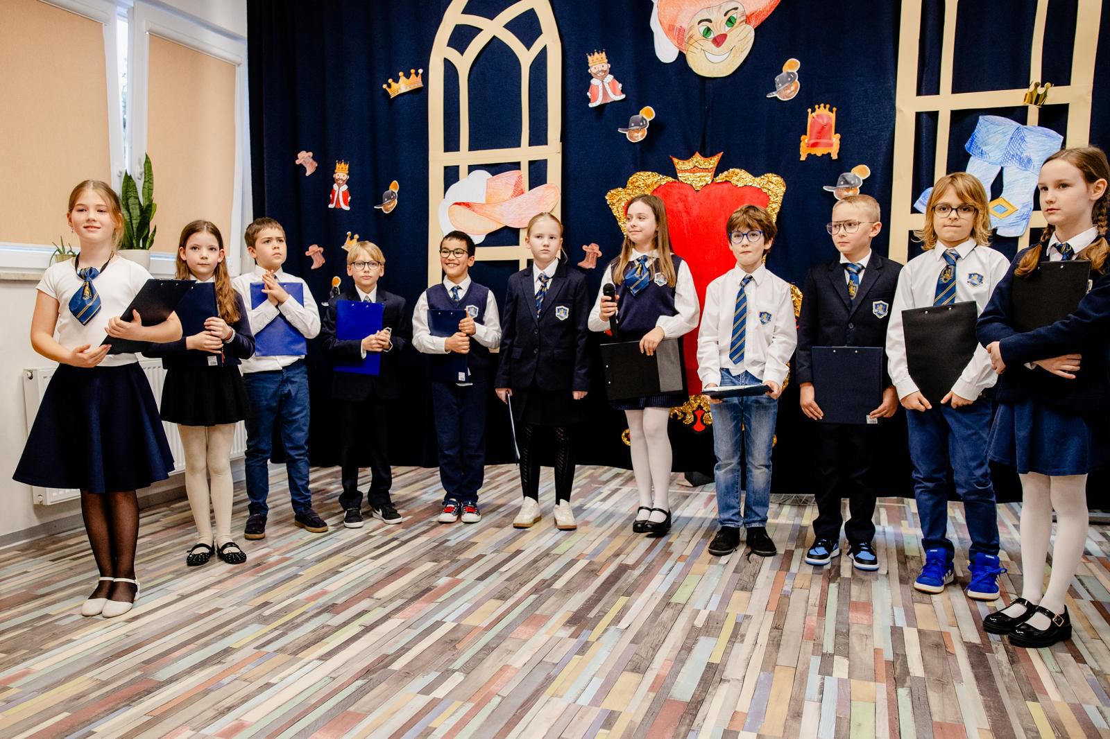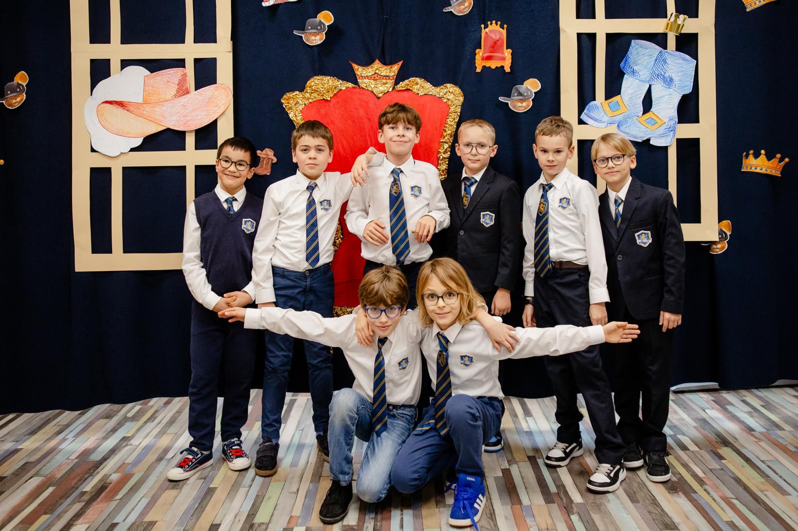 Druga część minikonferencji miała charakter artystyczny. Uczniowie wystąpili na scenie jako aktorzy w przedstawieniu „Puss in Boots”. Wszyscy zaprezentowali się w pięknych, starannie przygotowanych kostiumach, które wspaniale prezentowały się na scenie. Warto podkreślić, że niemal wszystkie elementy scenografii zostały stworzone własnoręcznie przez uczniów!