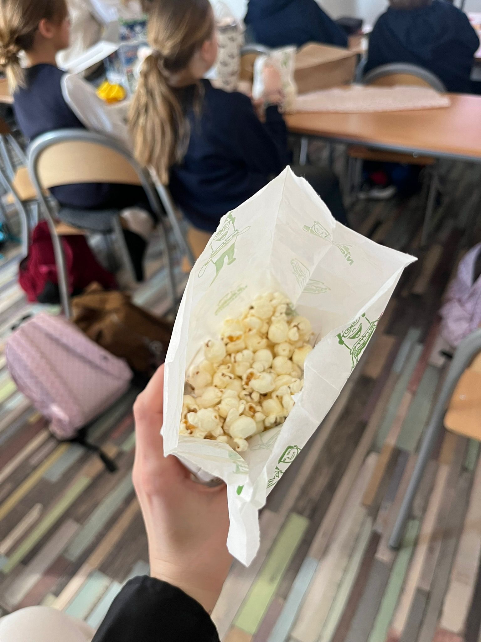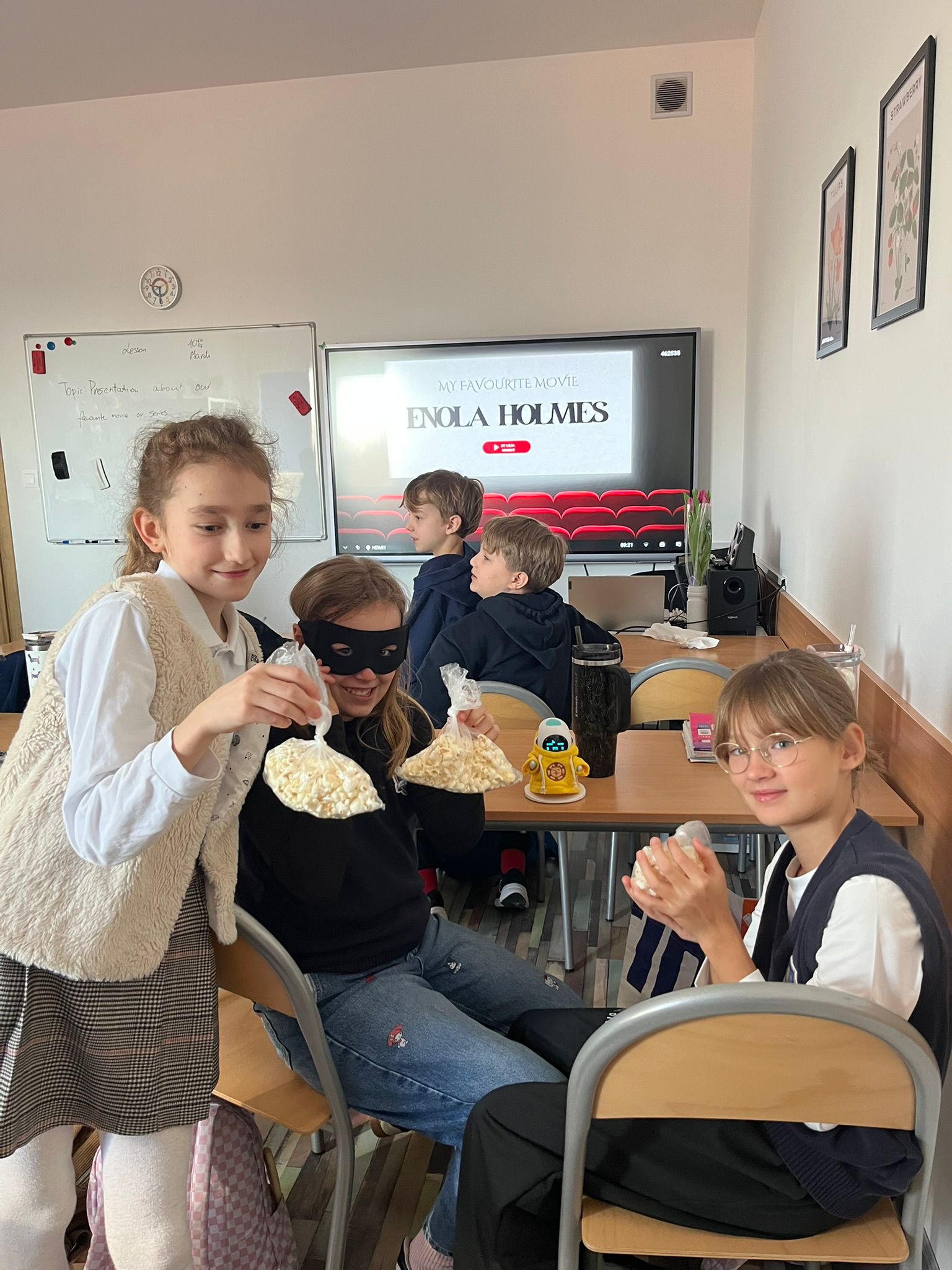 Dzieci przygotowały plakaty, prezentacje oraz krótkie opisy bohaterów i fabuły. Uczniowie ćwiczyli słownictwo, rozwijali umiejętność mówienia oraz dzielili się swoimi zainteresowaniami. Pojawiło się wiele inspirujących tytułów, ciekawych rekomendacji i świetnych pomysłów. Aby stworzyć prawdziwą kinową atmosferę, uczniowie samodzielnie przygotowali również popcorn, który towarzyszył prezentacjom. Dzięki temu nauka połączona była z zabawą, a sala lekcyjna na chwilę zamieniła się w szkolne kino. 🍿