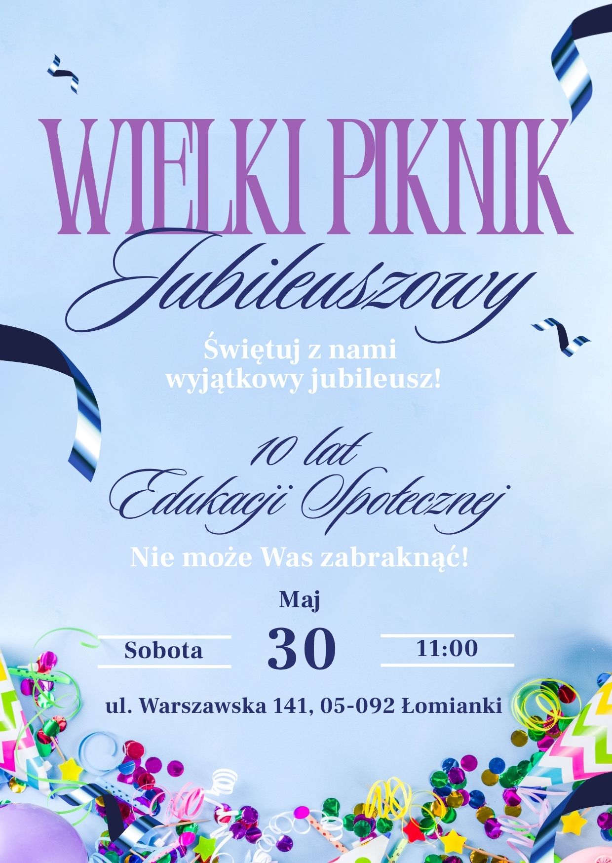 Z ogromną radością zapraszamy całą społeczność Edukacji Społecznej – uczniów, rodziców, absolwentów oraz przyjaciół naszych szkół – na Wielki Piknik Jubileuszowy, którym uczcimy nasze dziesięciolecie! 🎊🎈🎉